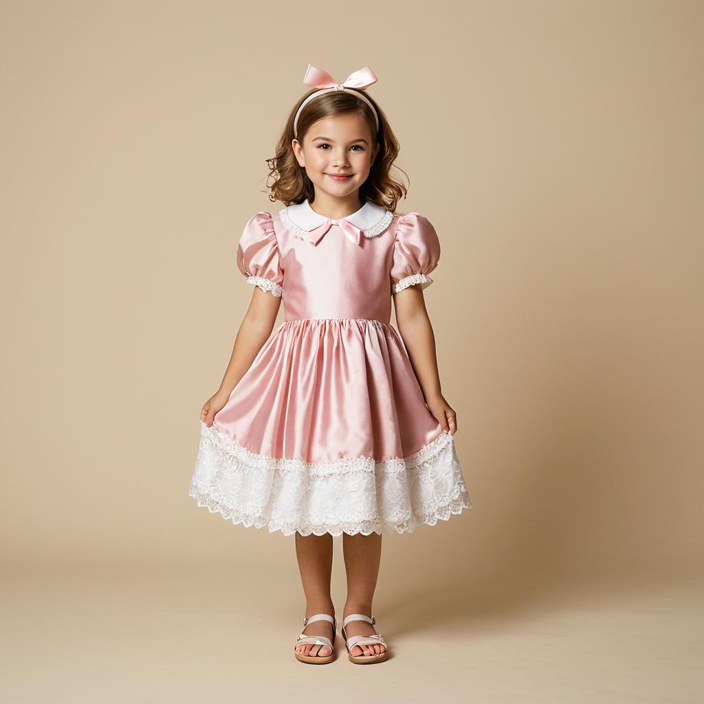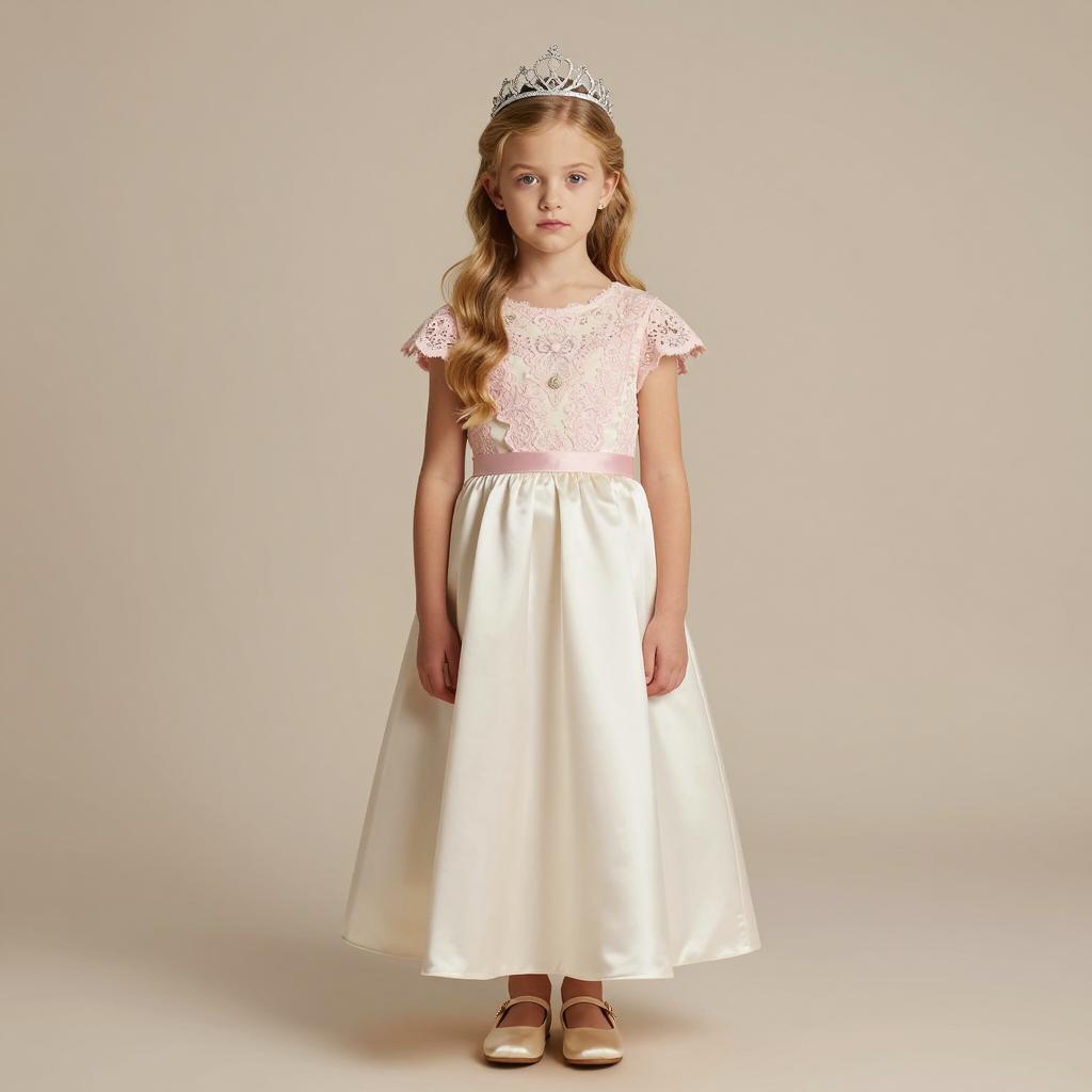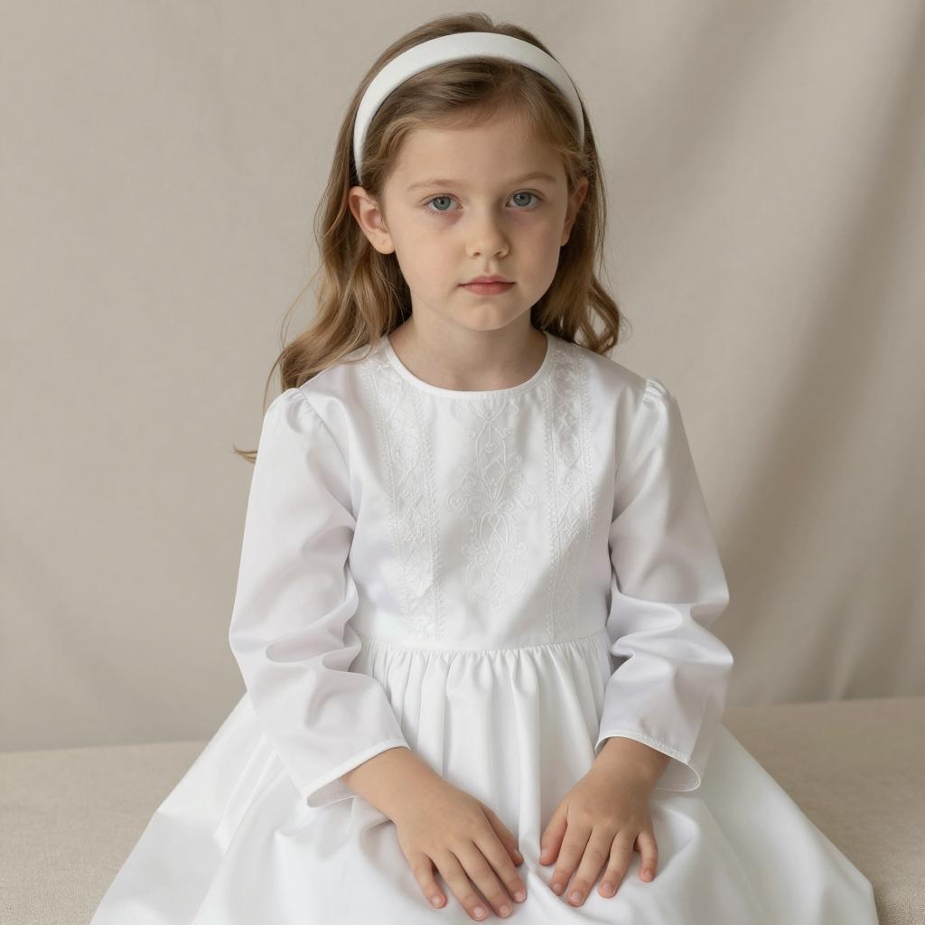 Baptism outfit, photograph of a young girl, light brown hair, wearing a white satin dress with long sleeves and embroidered chest detail, simple headband, sitting on beige fabric, hands resting on dress, neutral expression, soft lighting, realistic style, close-up, centered composition, child's dress, delicate ures