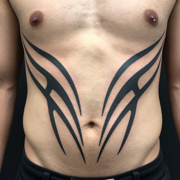 Symmetrical Tribal Blackwork Stomach Tattoo