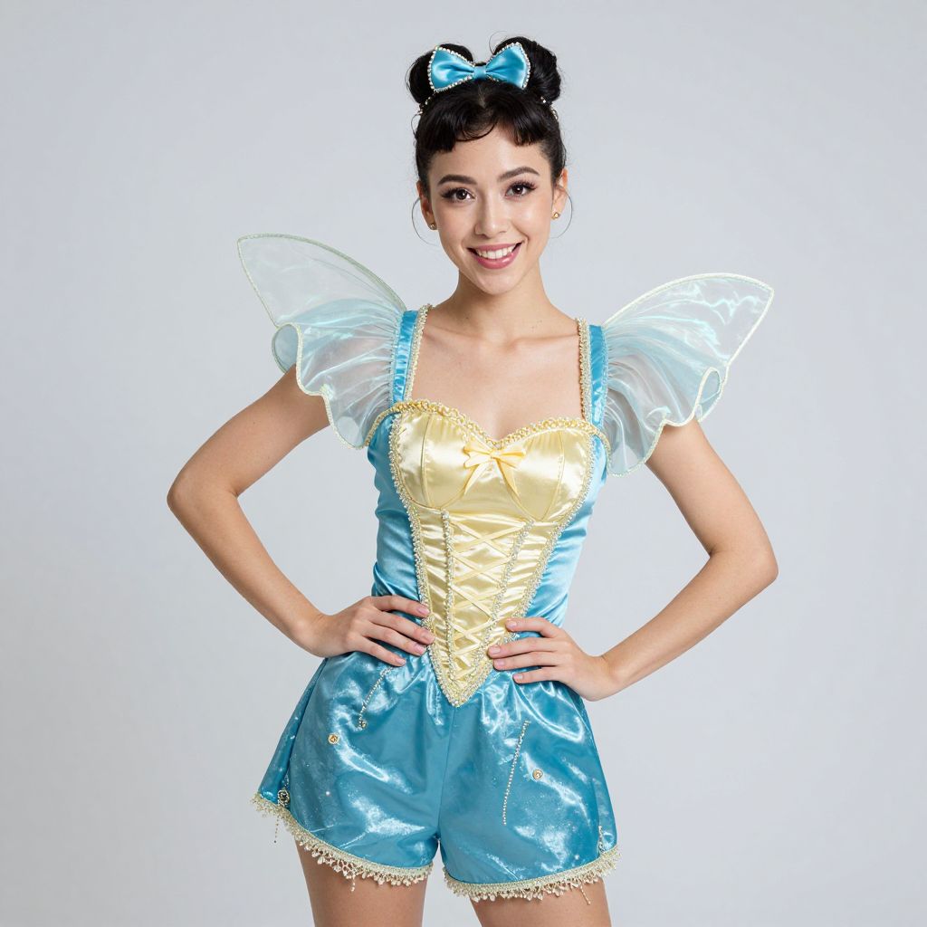 Photograph of a young woman with fair skin and black hair styled in a bun with a blue ribbon, smiling. She wears a blue and yellow fairy costume with a shiny blue bodice, yellow corset-style front, and blue shorts with white lace trim. She has translucent white fairy wings on her shoulders and stands with hands on hips against a plain white background. The costume has a glossy texture, and she exudes a cheerful, playful vibe.
