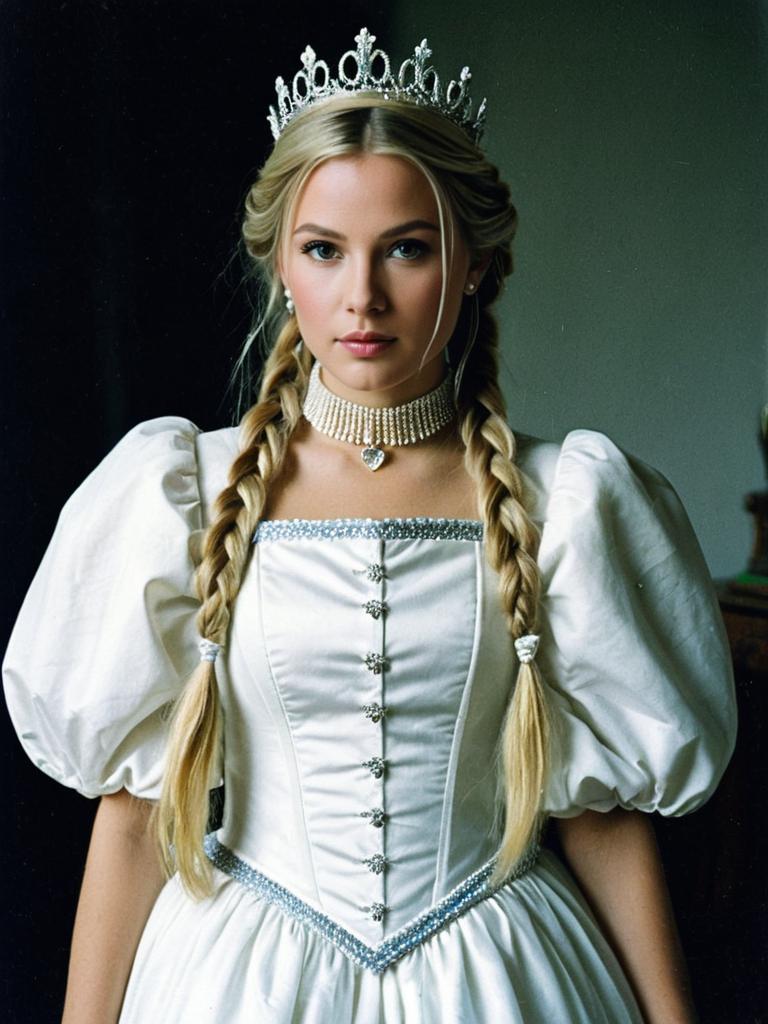Princess fairytale costume, solo, 1girl, blonde hair, dress, crown, long hair, white dress, puffy sleeves, braid, tiara, looking at viewer, standing, choker, single braid