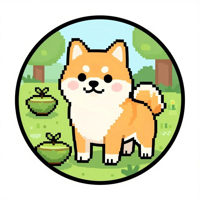 Adorable circle logo : shiba inu in a japanese tea garden detailed pixel art, cell shading, vivid colors, relaxing, cute,
