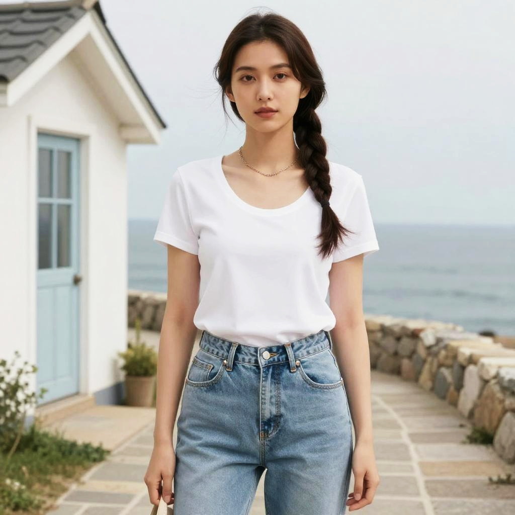 Photograph of a young woman with long dark hair, wearing a white graphic T-shirt with a snowman and pine trees, blue jeans, and holding