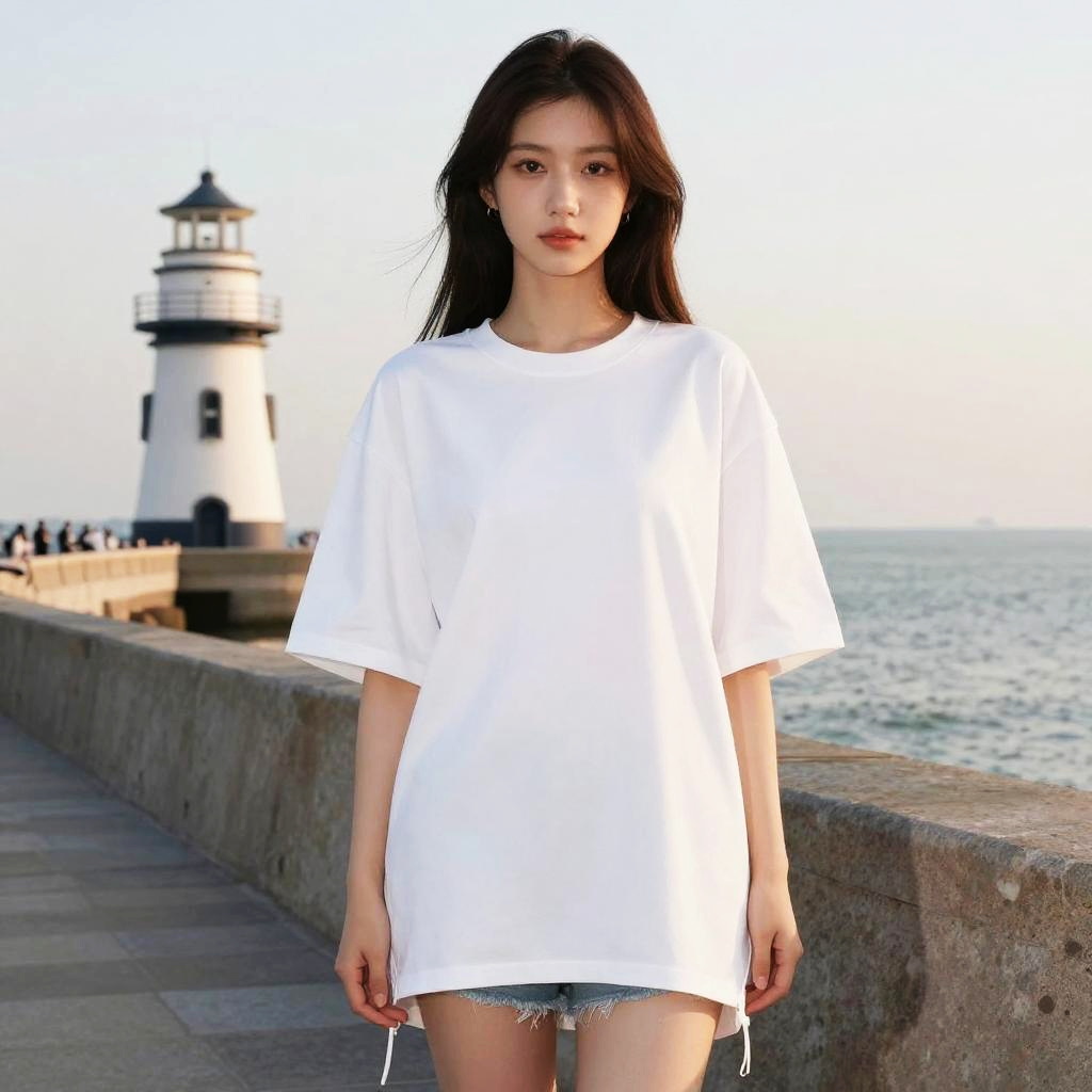 A woman, in a selfmade hero style, wearing an oversized graphic t-shirt featuring a snowy landscape and snowman in blue and white, paired with dark blue skinny jeans and a gold cuff bracelet, standing by a lake with a fishing rod. Sexy. Pretty face and beutiful eyes