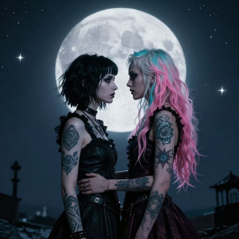 Photograph-style digital art: Two tattooed, gothic women with black and pink hair, facing each other, under a glowing full moon.