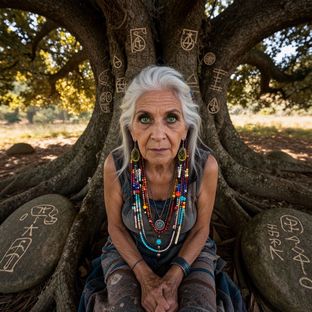 A highly detailed photorealistic portrait of an enigmatic Latin American woman, a wise fortune teller with deep wrinkles and intense green eyes, captured from a unique 'bug's-eye view' perspective. She sits under a large oak tree, its roots forming her seat, surrounded by ancient runes etched on stones. Soft golden light filters through leaves, illuminating her white hair adorned with colorful beads and the mystical symbols around her. The scene exudes an air of ancient wisdom and enigmatic allure, conveying the captivating aura of this extraordinary woman.