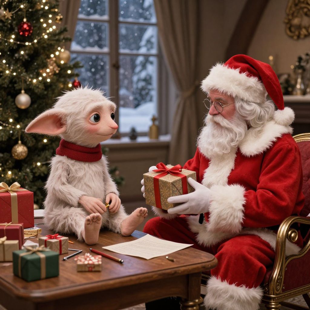 In this enchanting scene, a white, furry creature resembling Dobby the House Elf from the Harry Potter series is seated on a table, attentively observing a man dressed as Santa Claus. Santa, with his white beard and glasses, is holding a wrapped gift, seemingly preparing it for the sleigh. The table is cluttered with various objects, including small boxes and a piece of paper, suggesting a busy workshop atmosphere. The background features a Christmas tree adorned with lights and ornaments, enhancing the festive mood. The room is warmly lit, with a window revealing a snowy landscape outside, adding to the cozy and magical ambiance. The overall composition captures a heartwarming moment of holiday preparation, with Dobby and Santa engaged in the act of gift wrapping, creating a sense of anticipation and joy.