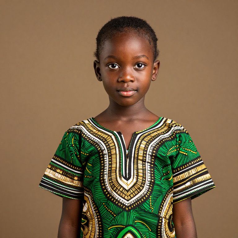 A young girl with dark hair is wearing a traditional African dress with a green and gold pattern.