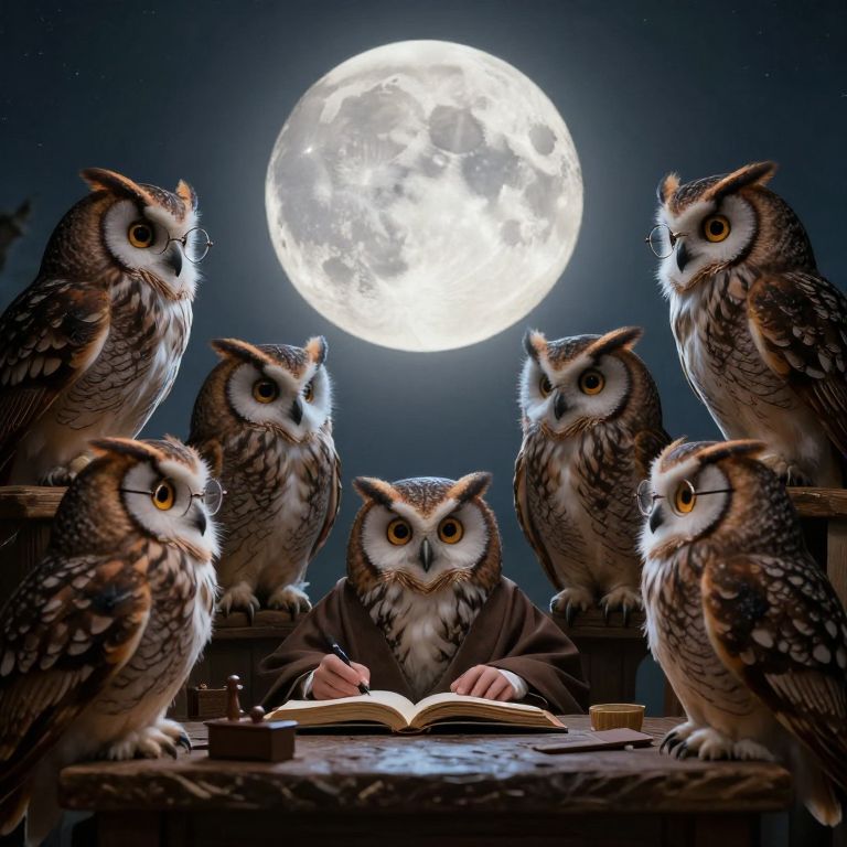Six wise owls, donned in scholarly robes and spectacles, intently debate the ethics of moonlight taxation under the radiant glow of a luminous, detailed full moon.