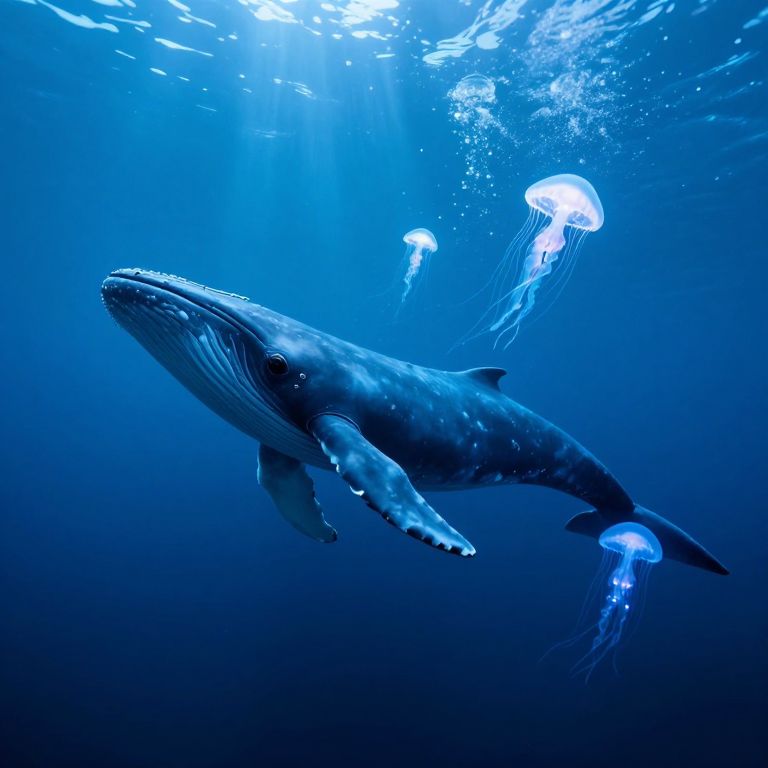 Photograph of a large blue whale gliding through deep, blue ocean water, accompanied by three glowing, translucent jellyfish above.
