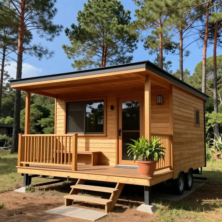 Cozy log cabin nestled amidst tall pine trees, featuring a vibrant yellow exterior, a welcoming porch with wooden railings, and a red front door accented by a circular window, surrounded by potted plants and a paved pathway leading to its inviting entrance.