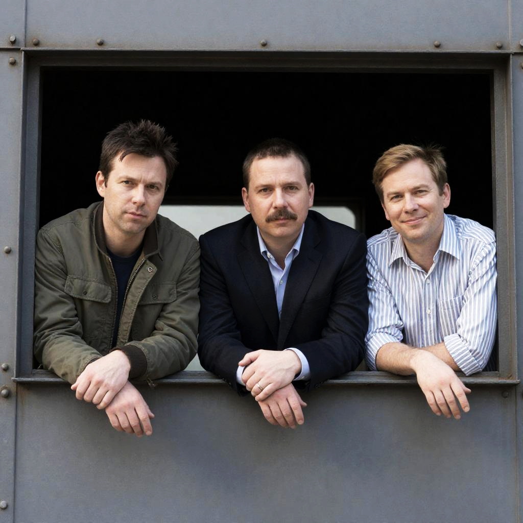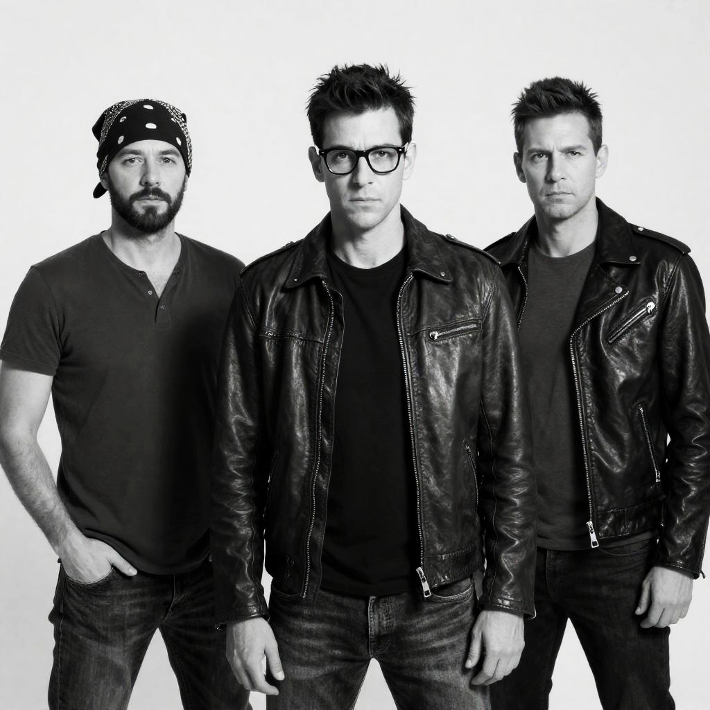 Black-and-white photograph of four men in a sunlit room with wooden furniture. One man leans over a table in the foreground, others lie on a couch in the background. High contrast shadows. Casual clothing. Intense expressions.