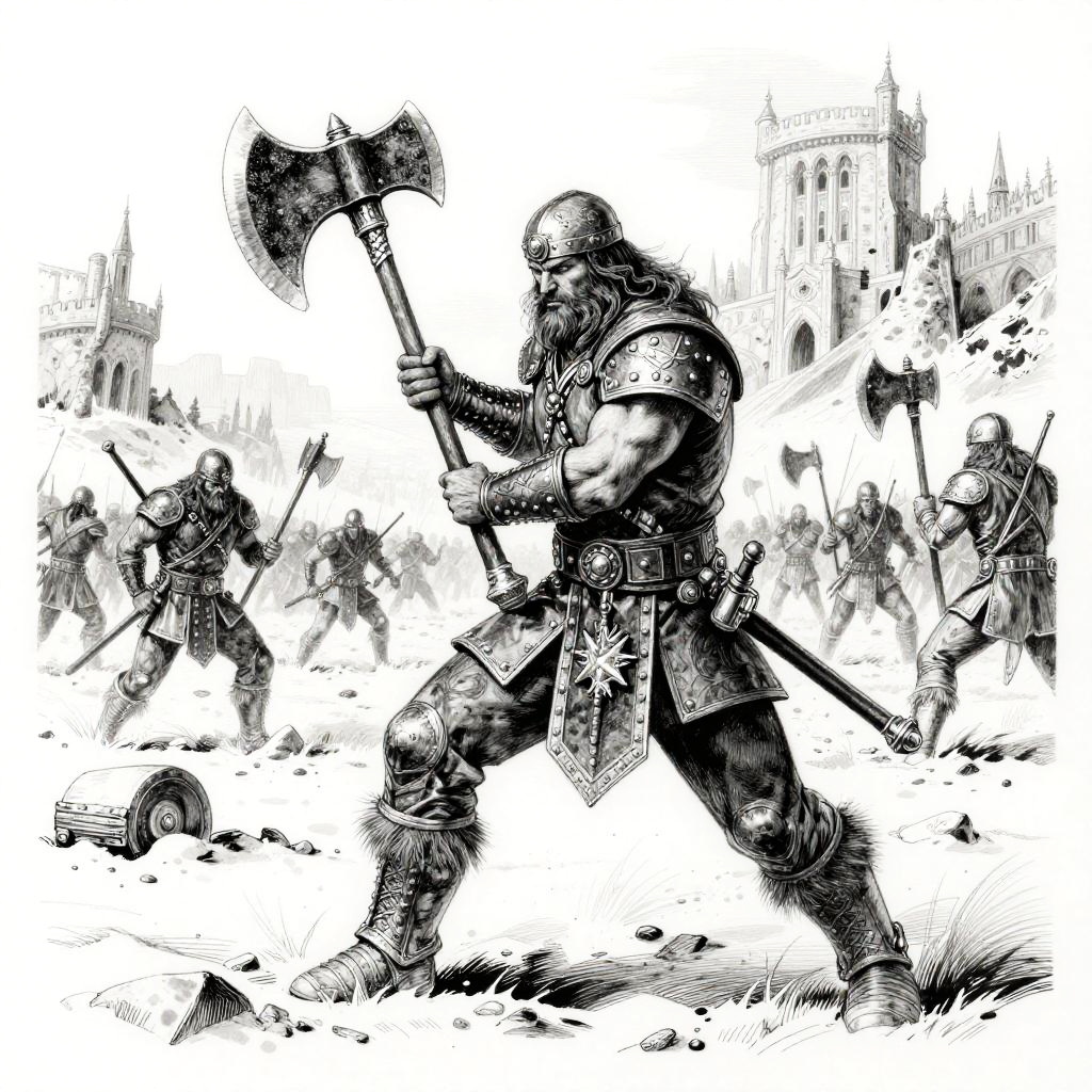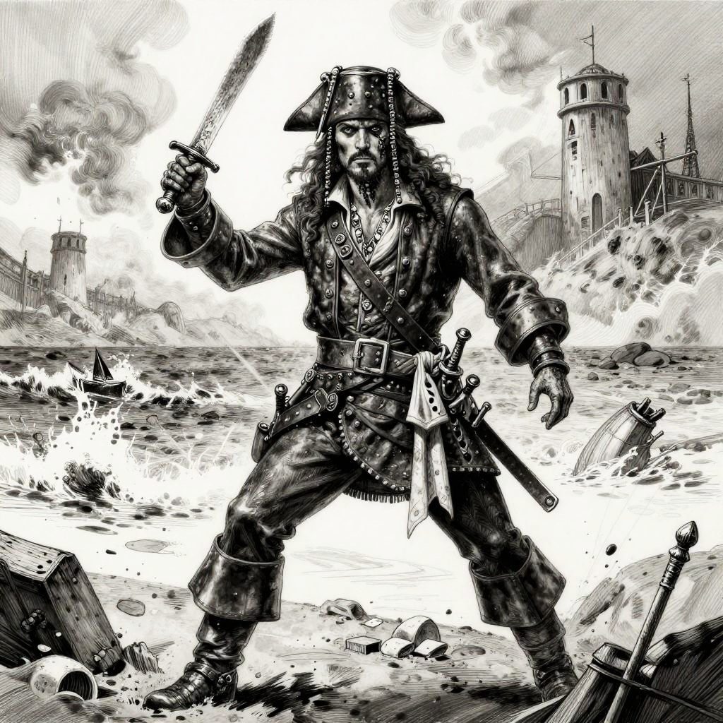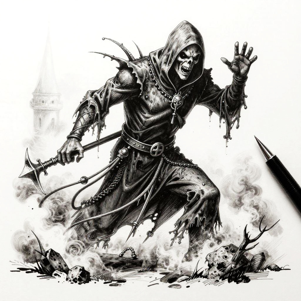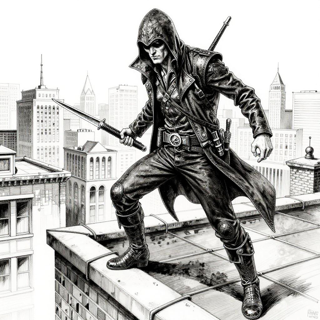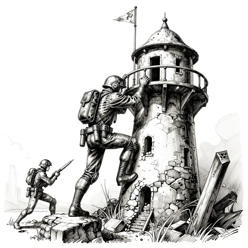 Pen and ink drawing of a stealthy scout climbing a ruined watchtower, fighting fantasy style, highly detailed, inspired by Steve Jackson and Ian Livingstone