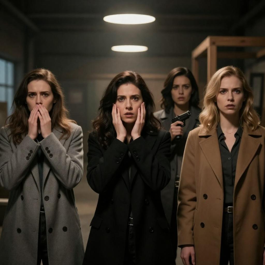 Photograph of a military setting. A woman with brown hair in a black jacket stands in the center, flanked by three soldiers in camouflage uniforms with helmets and gear. The soldiers have intense expressions, one gripping her arm. The background shows a dimly lit, metal-walled structure with overhead lights.