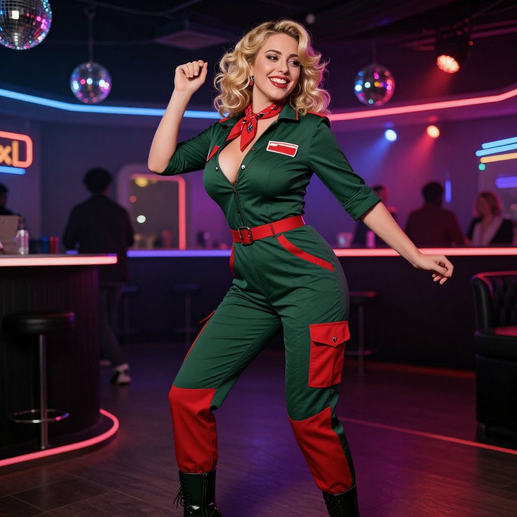 Photograph of a blonde woman in a retro, green and red jumpsuit with a deep V-neck, showcasing ample cleavage. She has curly hair, red lipstick, and is striking a confident, dancing pose with one fist raised and the other arm out. The background is a vibrant, neon-lit nightclub with a bar, patrons in silhouette, and reflective disco balls overhead. The woman's jumpsuit features a red scarf, belt, and cargo pockets. She stands on a dark wooden floor, illuminated by colorful lights, creating a lively, energetic atmosphere.