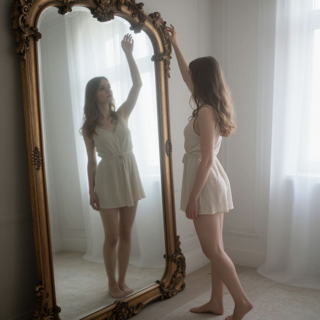 Woman stands barefoot before an ornate mirror, her reflection mirroring her gesture as she raises one hand, both figures seemingly reaching toward each other through the hazy, ethereal light that fills the room.