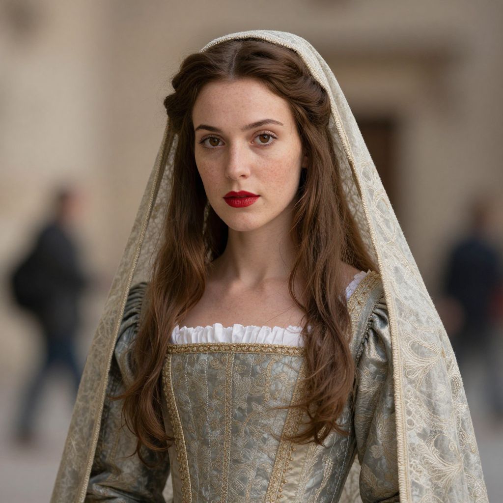 Renaissance costume female, 1girl, solo, brown hair, dress, veil, looking at viewer, blurry background, realistic, freckles, long sleeves, red lips, blurry, long hair, upper body, puffy sleeves
