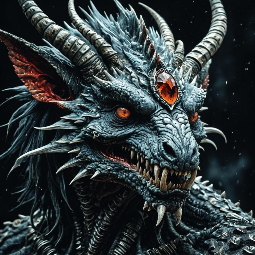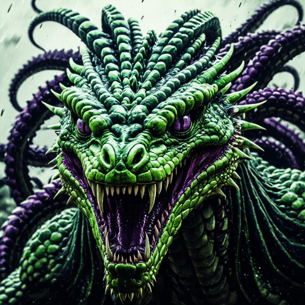 Highly detailed concept art of a mythical hydra with multiple heads. The creature features a slimy green textured reptilian skin with dark purple streaks and menacing sharp teeth. The close-up view highlights the fierce expression and scaly body parts, showcasing fantasy creature design with a dark and dramatic atmosphere.