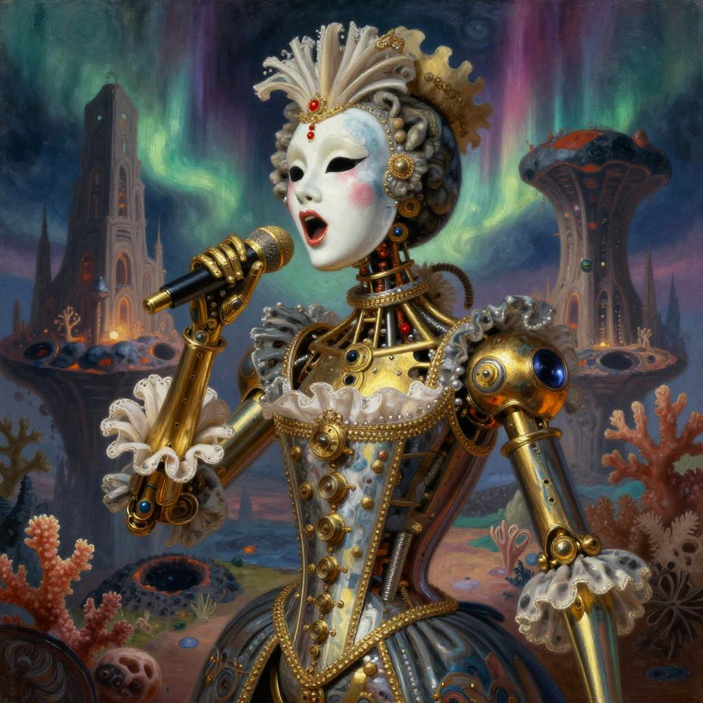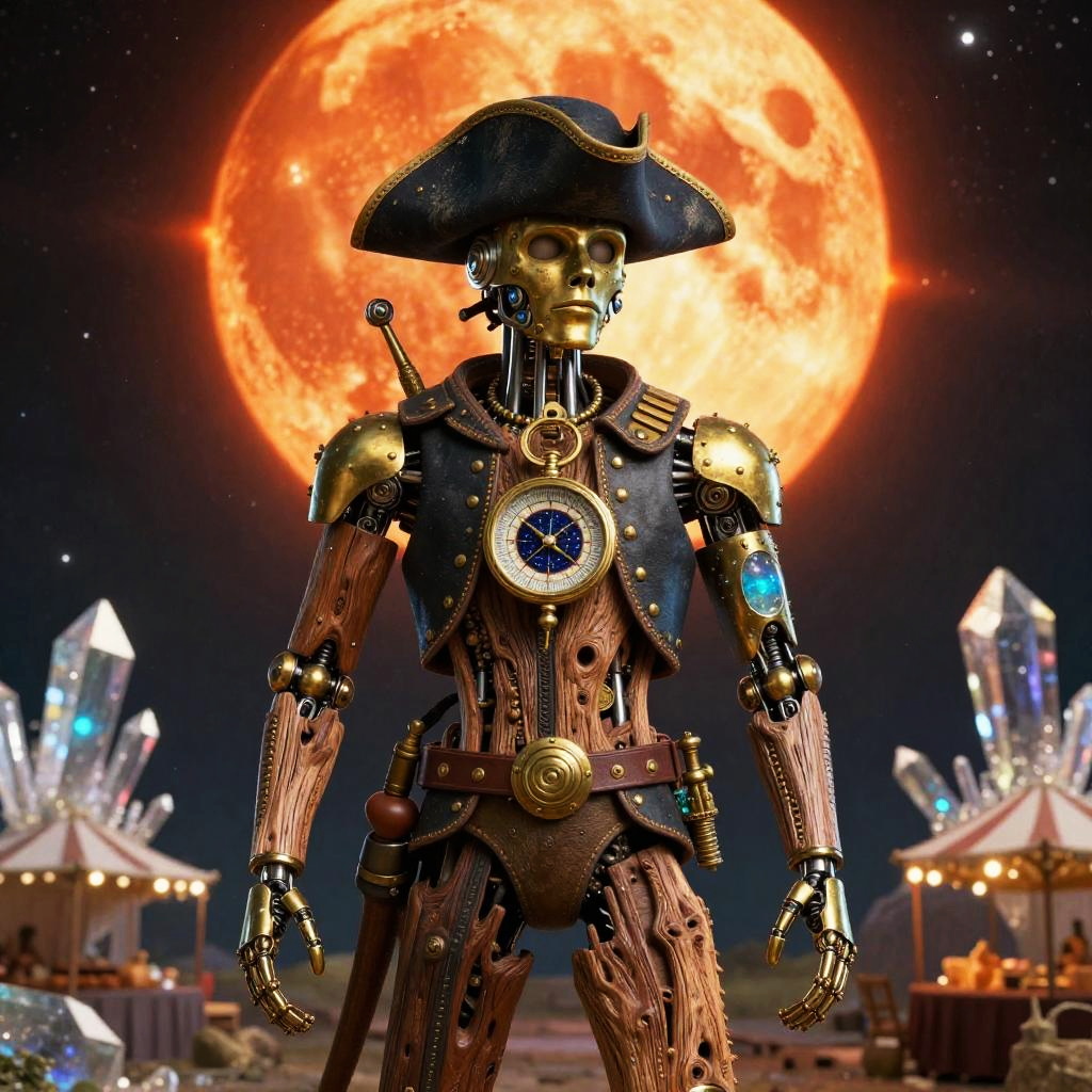 Imagine a captivating character design featuring a clockwork mantis assassin with bioluminescent plating and retractable blade-arms set against a backdrop inspired by an abandoned orbital ship graveyard beneath a looming gas giant. Rendered in photorealistic HDR cinematic matte painting at ultra-wide 6K, this scene includes elements inspired by H.R. Giger and showcases unique accessories.