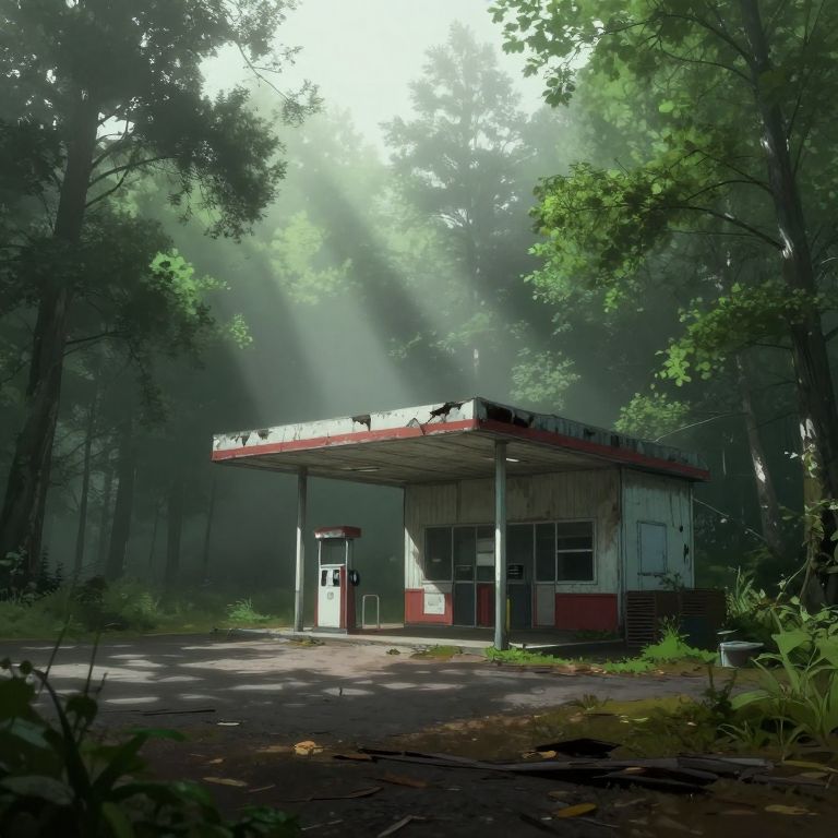 Photograph-style digital artwork of a deserted, sunlit gas station nestled in a dense, misty forest with sunlight filtering through tall trees.