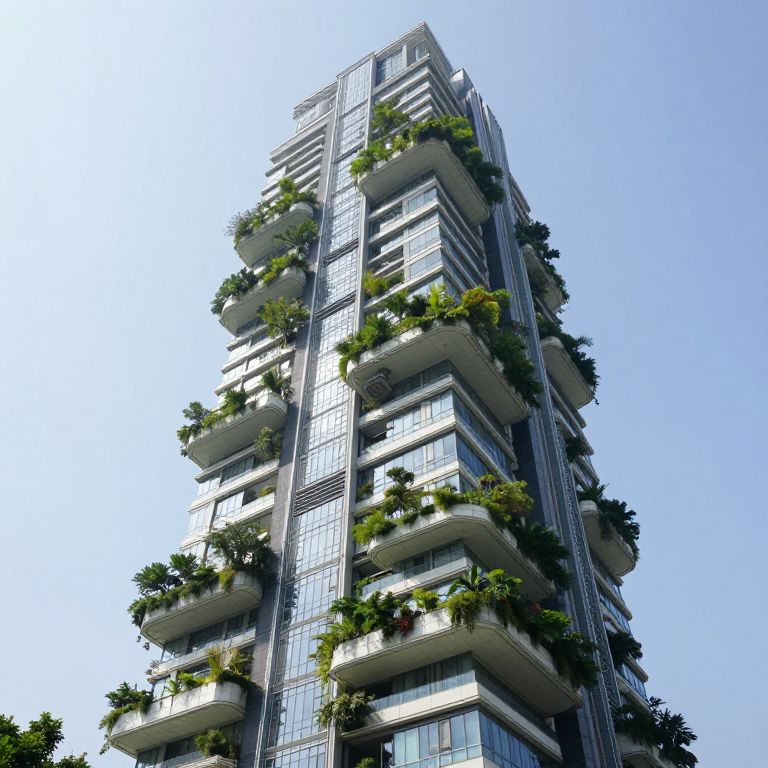 Photograph of a modern, tall skyscraper with a sleek, glass facade. The building features numerous balconies on each floor, adorned with lush green plants and small trees, creating a vertical garden effect. The structure is asymmetrical and slightly angled, with a white and gray color palette. The clear, bright blue sky in the background contrasts with the building's reflective glass windows. The overall architectural style is contemporary and environmentally conscious. The image is taken from a low angle, emphasizing the height and vertical design of the skyscraper.