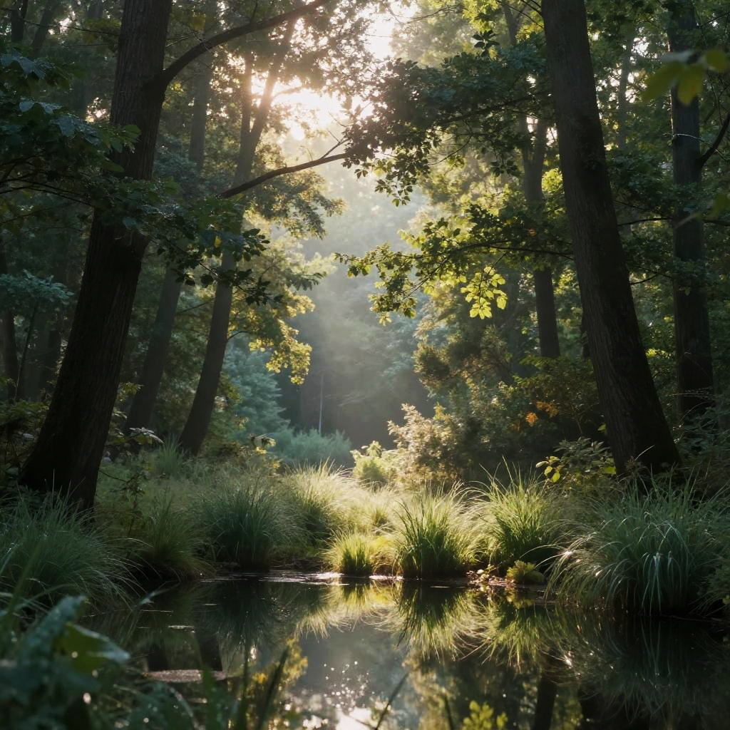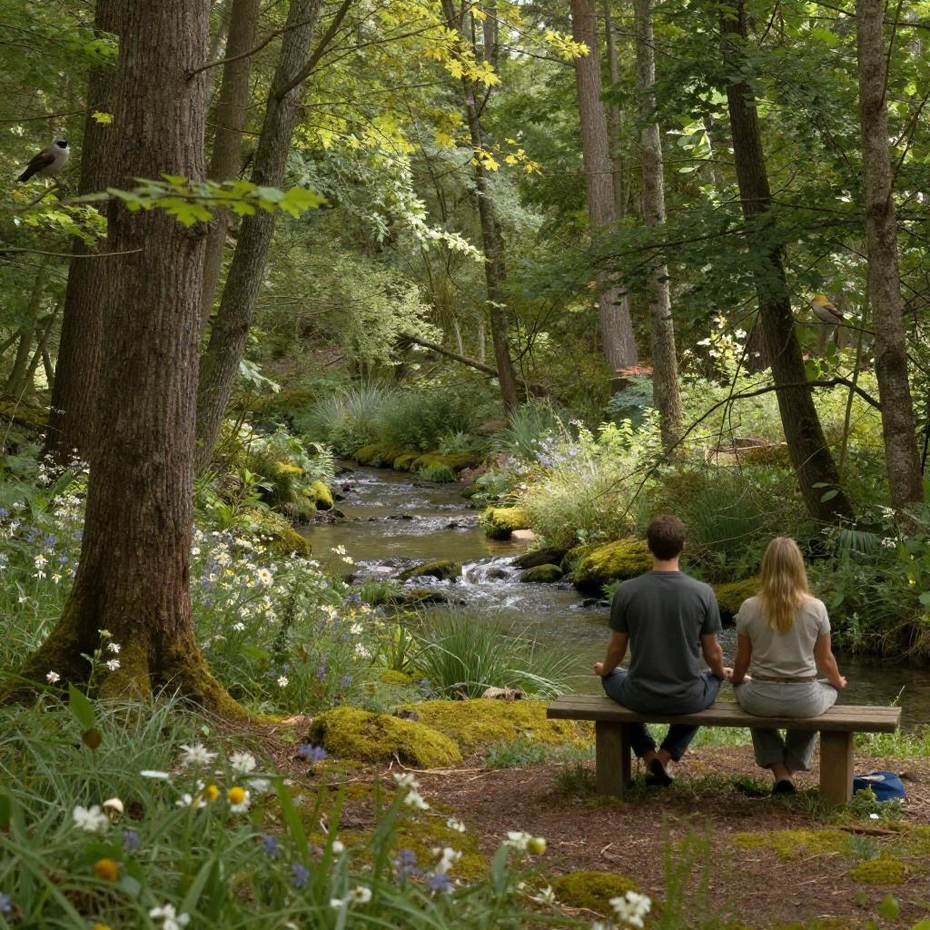 A tranquil forest scene encouraging a relaxed atmosphere, tall trees with dappled sunlight filtering through leaves, a gentle stream flowing nearby, a couple sitting on a wooden bench meditating, wildflowers blooming, birds perched on branches, soft moss covering the ground creating a peaceful natural retreat.