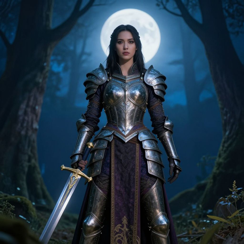 In this visually captivating image, a powerful woman stands poised in a mystical forest, illuminated by the light of a full moon. Clad in ornate armor with intricate detailing, she wields a gleaming sword, embodying a regal warrior spirit. The artistic style merges fantasy elements with a vibrant color palette, creating an enchanting atmosphere.