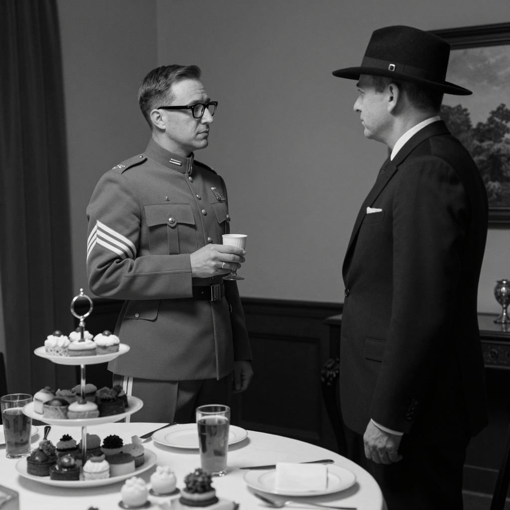 Black and white photograph of two men in a dimly lit room. One man in a military uniform with glasses and striped sleeves stands holding a goblet, facing the other man in a dark suit and black hat. A table with multiple tiers of food and dessert dishes is in the foreground. Both men are standing, facing each other, with neutral expressions.