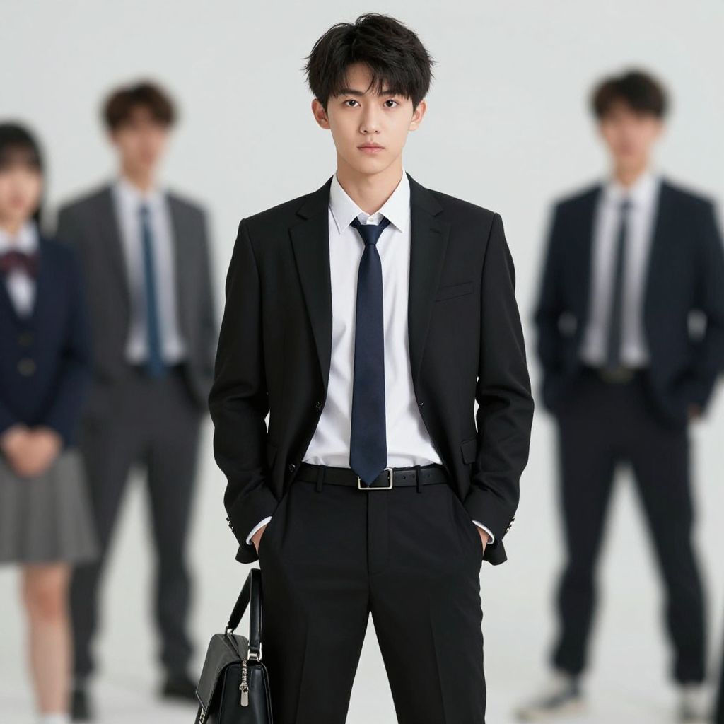 "famous five costume, necktie, black pants, shirt, jacket, white shirt, blurry background, pants, collared shirt, 1boy, black jacket, realistic, blurry, suit, looking at viewer, male focus, solo focus, hands in pockets, formal, black necktie, short hair, belt, closed mouth, asian, black hair, blue necktie, standing, bag Realistic photo of casual sexy person with pretty face"
