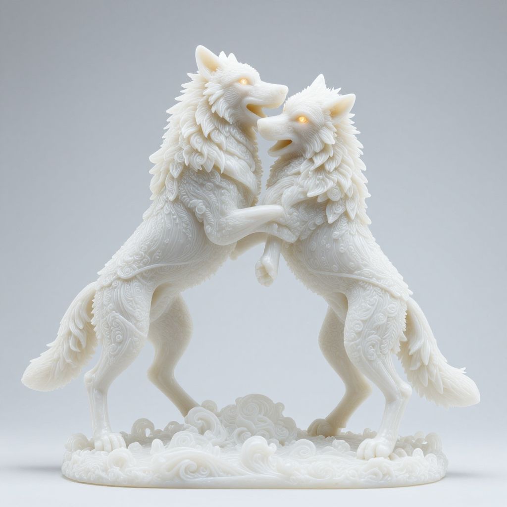 Style of Janine Antoni, sculpture in ((Verdigris )) of sculpture a two wolves at play, glowing eyes, white plastic, diffuse lighting, fantasy, intricate, elegant, highly detailed, photorealistic, sharp focus, soft lighting, vibrant colors, masterpiece