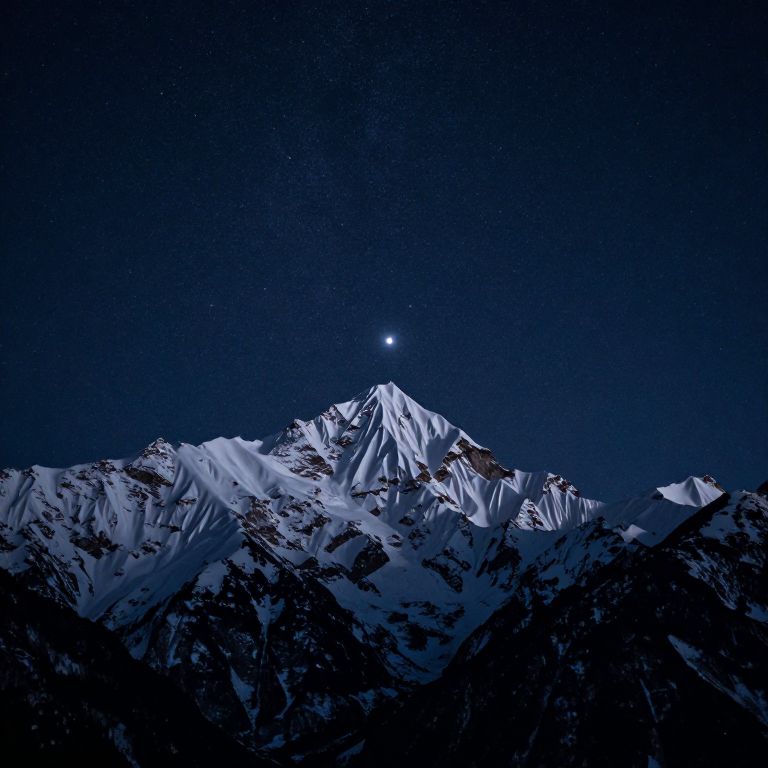 Snow-covered peaks rise sharply against a star-studded night sky, their geometric folds reflecting the luminescent glow of a solitary bright star, creating a mesmerizing celestial tapestry that seems to whisper ancient stories to the silent winds.