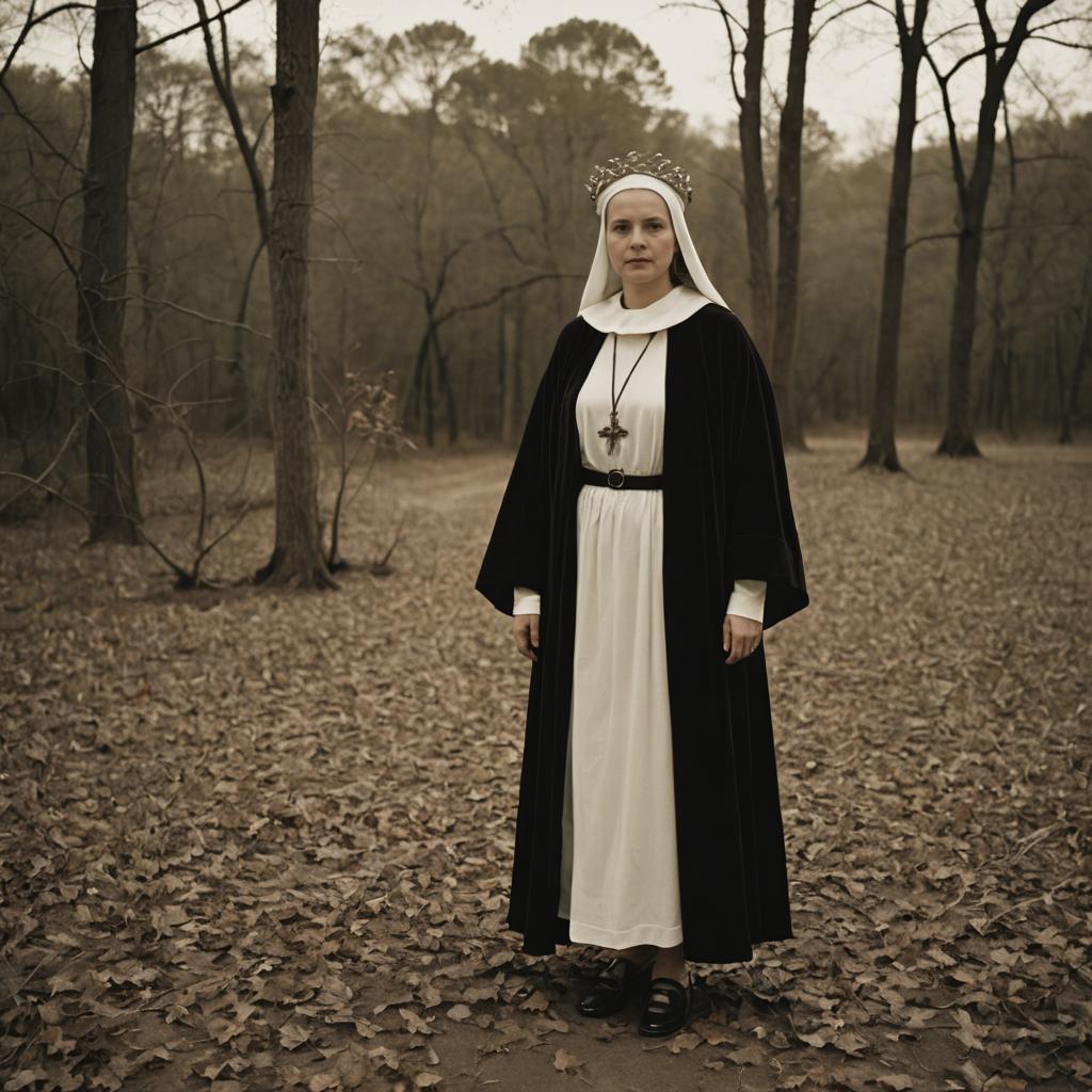 Portrait of a woman standing on a forest path covered with dry autumn leaves. She wears a traditional nun's outfit consisting of a black velvet habit, white nylon coif, and a long sepia-toned robe. She accessorizes with a braided crown and modest sandals, surrounded by leafless trees in a nature reserve setting.