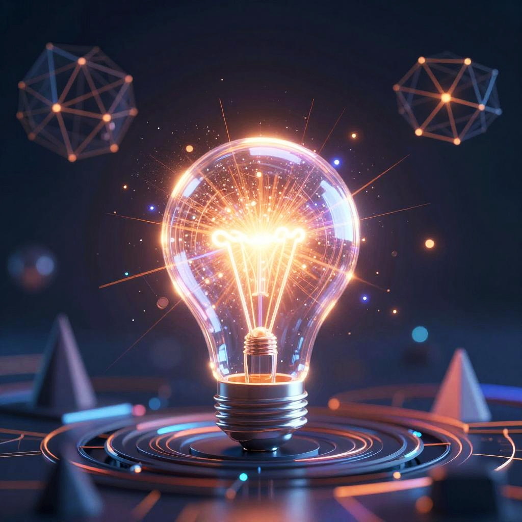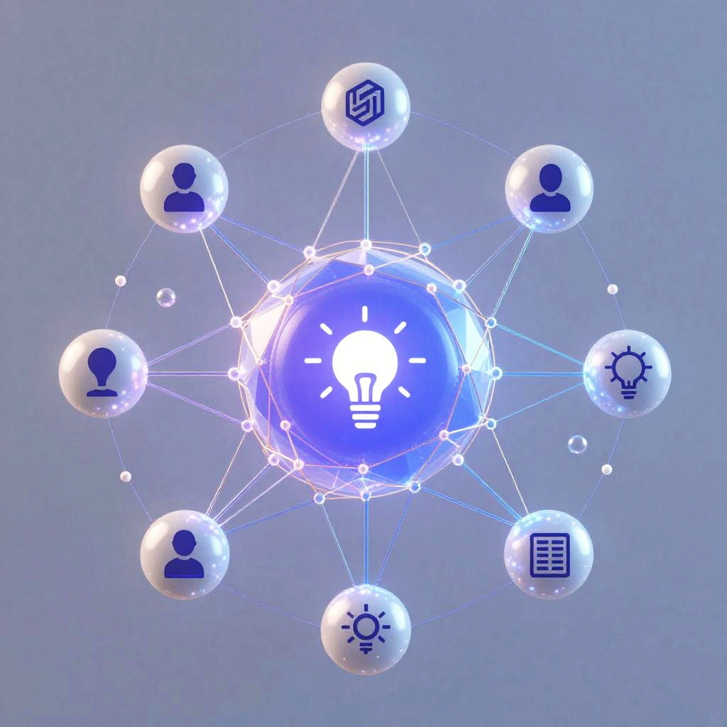 Digital illustration of a network diagram on a blue gradient background. At the center is a glowing blue circle with a white lightbulb icon, surrounded by six translucent white circles, each containing a different icon: a person, gear, sun, user, circuit, and fan. Each circle is connected to the central circle by thin, glowing lines, forming a star-shaped network. The icons are blue, matching the overall cool color scheme. The image has a modern, tech-savvy aesthetic, emphasizing connectivity and collaboration.
