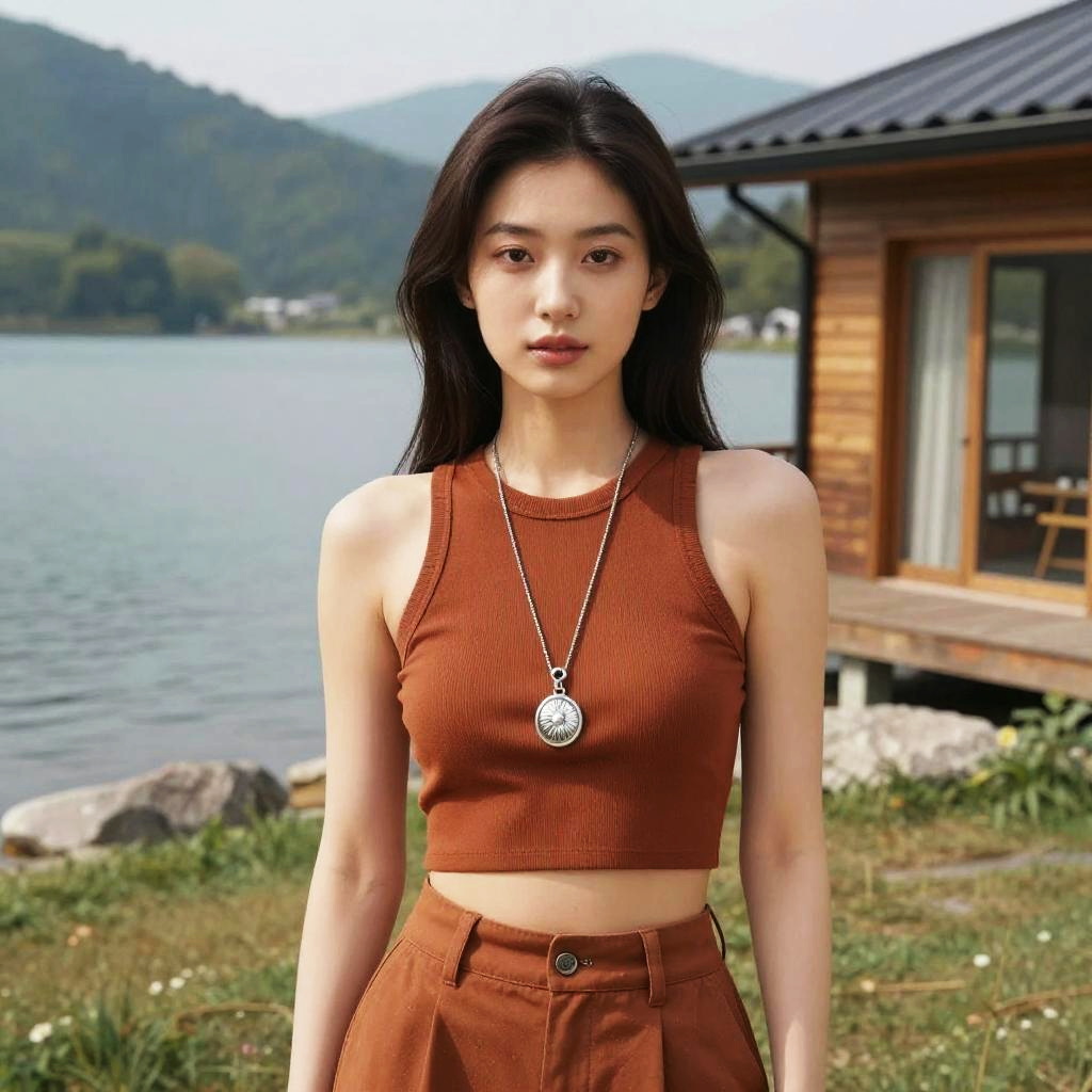 A woman, in a selfmade hero style, wearing a rust-colored sleeveless crop top and high-waisted shorts, standing in a serene lakeside mountain lodge, with a long silver pendant necklace adding a touch of elegance. Sexy. Pretty face and beutiful eyes