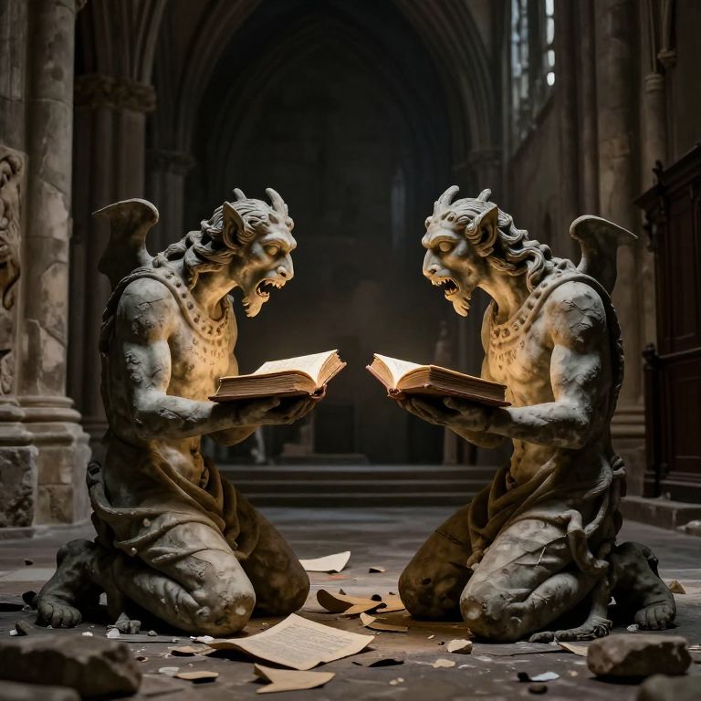 In the shadowed corridors of a crumbling cathedral, two gargoyles kneel amidst scattered fragments of stone, their fierce forms illuminated by the soft glow of ancient books they hold—symbolizing the eternal struggle between chaos and order, as they debate the weight of words in a world built from forgotten dreams and unspoken truths.