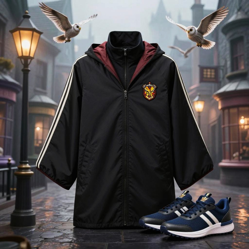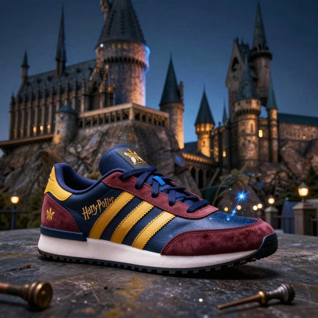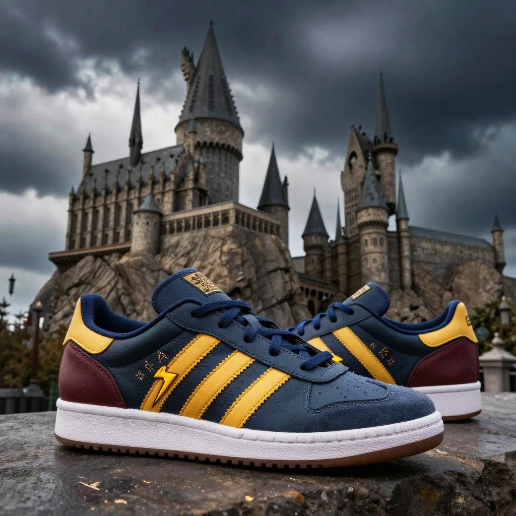 Adidas Harry Potter sneakers with house colors and lightning bolt designs, set against a stormy sky over Hogwarts castle, detailed textures and magical ambiance.
