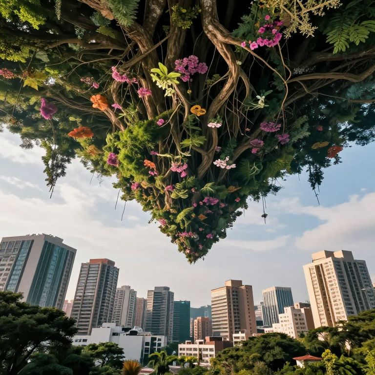 Cities grow upside-down from the bottom of a colossal inverted forest, with roots flowering above and canopies plunging into skyless voids.