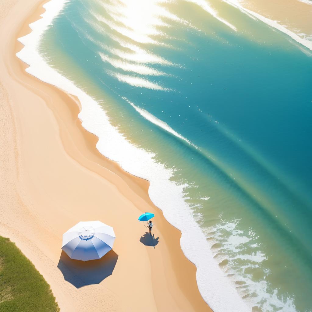 Aerial view of a woman standing barefoot on a sandy beach holding a multicolored umbrella. The calm ocean water reflects the bright sunlight, creating a serene and peaceful atmosphere. The woman is dressed in a white sleeveless dress and wearing a headband, casting long shadows on the sand.