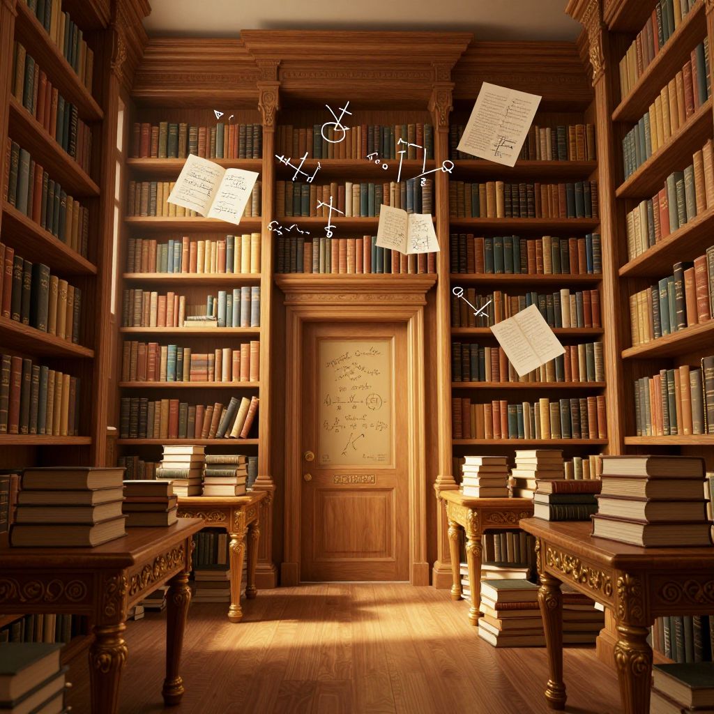 A serene, high-definition 3D-rendered library bathed in golden hour light, featuring towering wooden shelves filled with ancient books, ornate tables laden with stacked volumes, and a central door adorned with inscriptions, evoking a timeless atmosphere where sentient mathematical equations might whisper solutions through levitating theorems in elegant calligraphy.
