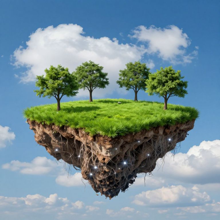 Suspended in mid-air, a triangular island of vibrant green grass and four neatly spaced trees floats against a backdrop of deep blue sky dotted with fluffy white clouds, its underside revealing a mirrored reflection of the landscape below, creating an illusion of a meadow growing upside down amidst a soil-like layer of cascading roots and starlight.