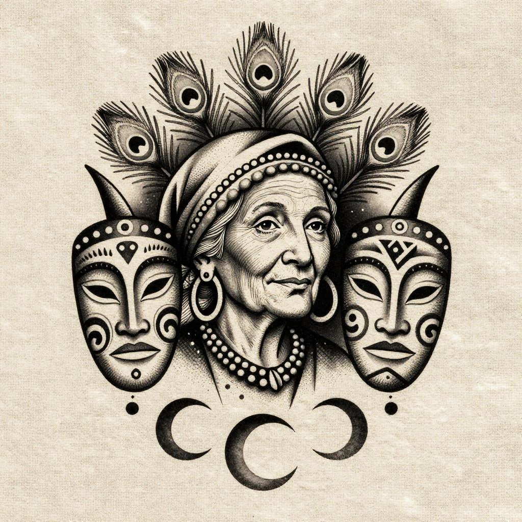 Monochrome ink illustration in a vintage tattoo flash aesthetic featuring elderly woman with a beaded headscarf and large hoop earrings, framed by peacock feathers above, tribal masks on sides, and crescent moons below. Printed on sun-bleached linen fabric, with crisp linework, stippling and crosshatching, bold negative space, subtle vignette, museum-print finish, high contrast, fine detail, gritty yet elegant mood.