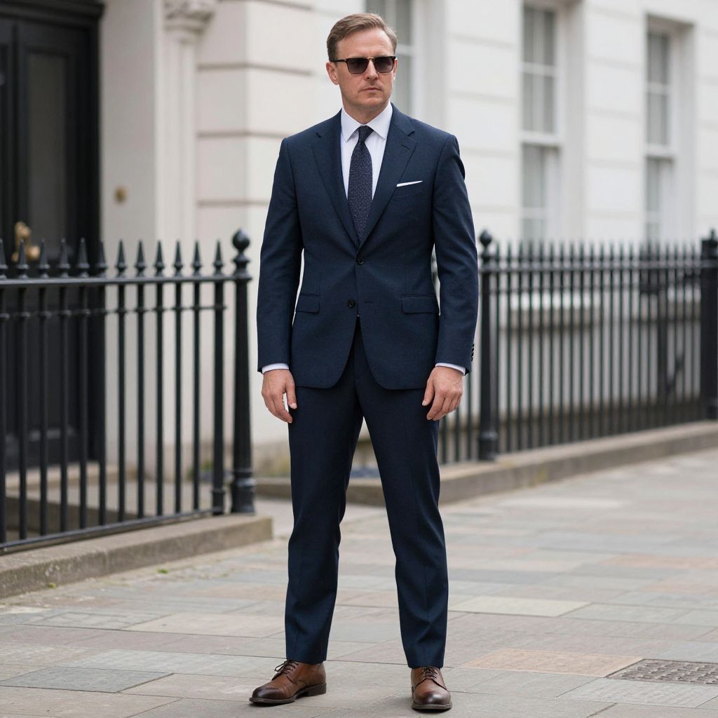British Man Clothing Style, man in a suit and tie standing in a street