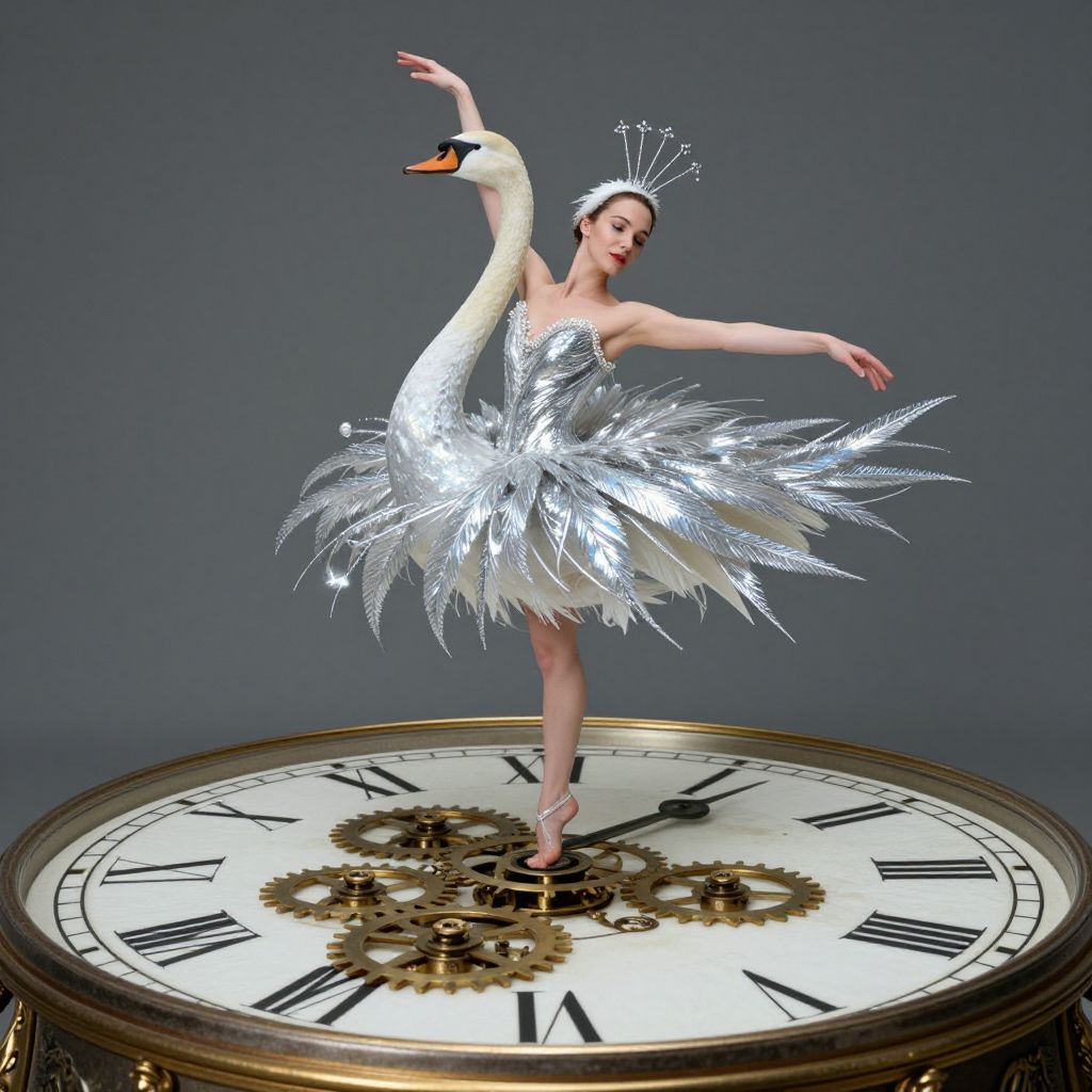 Photograph of a ballerina in a silver, metallic tutu with shimmering feather-like details, standing on one leg in an elegant pose atop a large, vintage-style clock face. The tutu is adorned with a white, swan-like headdress featuring an orange beak. The ballerina's arms are gracefully extended, and she wears white ballet slippers. The clock face has black Roman numerals and intricate golden gears visible beneath her feet. The background is a solid, dark gray, highlighting the ballerina and clock. The overall image combines elements of ballet and clockwork, creating a surreal, whimsical effect.
