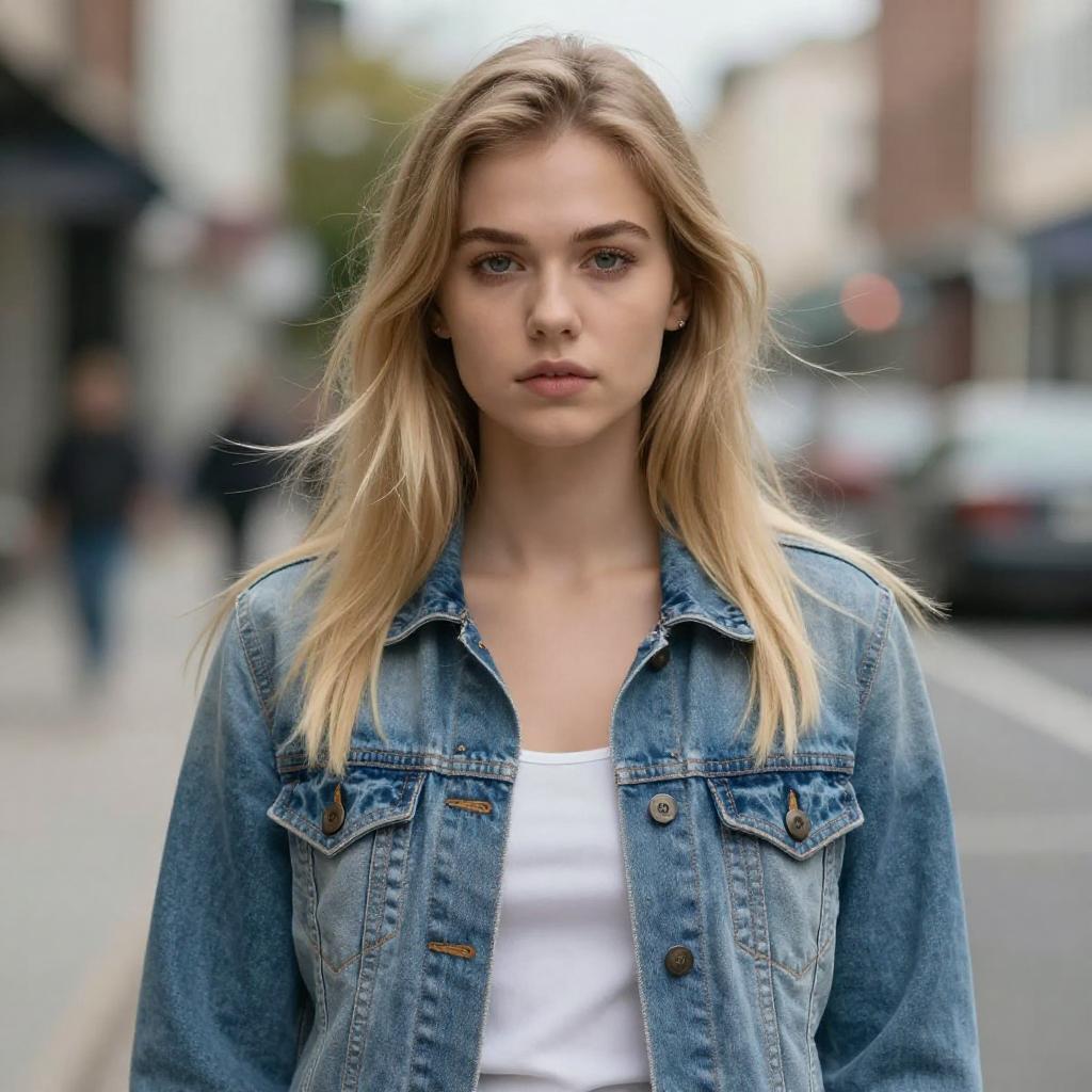 Photograph of a blonde, blue-eyed young woman with straight hair, wearing a denim jacket over a white top, standing on a blurred urban street.