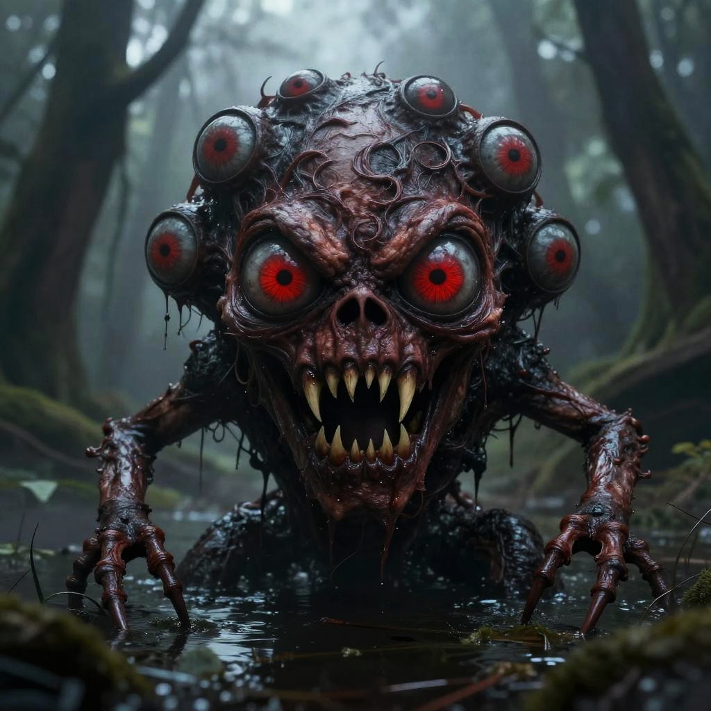 Six-Eyed Horror Creature in Swamp