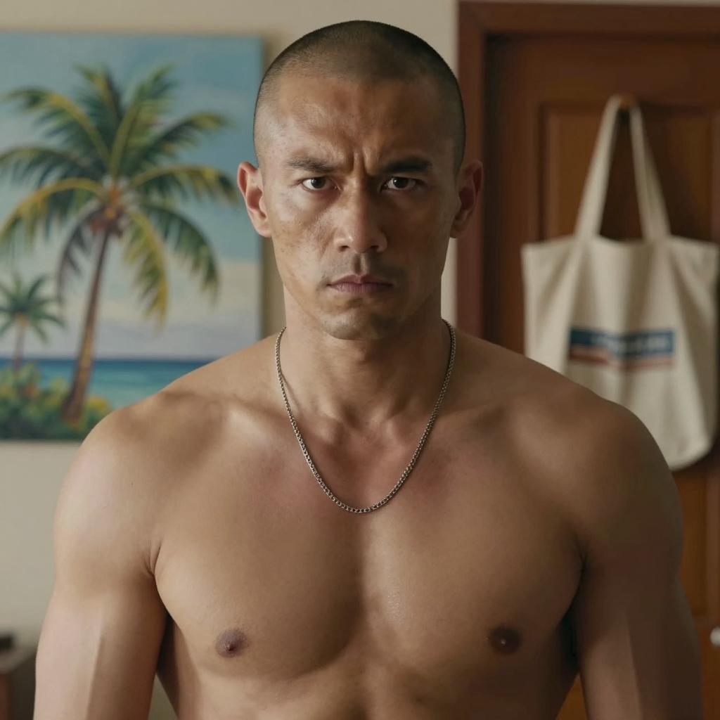 Muscular Asian man with short black hair, wearing a tight olive-green t-shirt, and dark pants, stands with hands clasped in front of him. Background includes wooden crates and industrial blue metal. Dim lighting. Intense facial expression.