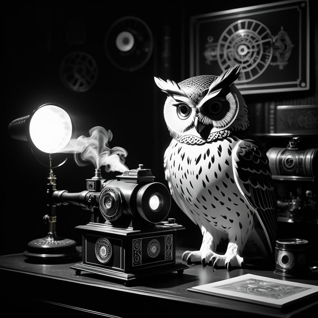 Black and white 1920s aesthetic image featuring a detailed owl figurine beside a classic film projector emitting smoke in a dark room. Soft table lamp illuminates the scene, evoking a vintage noir atmosphere with visible film grain texture.