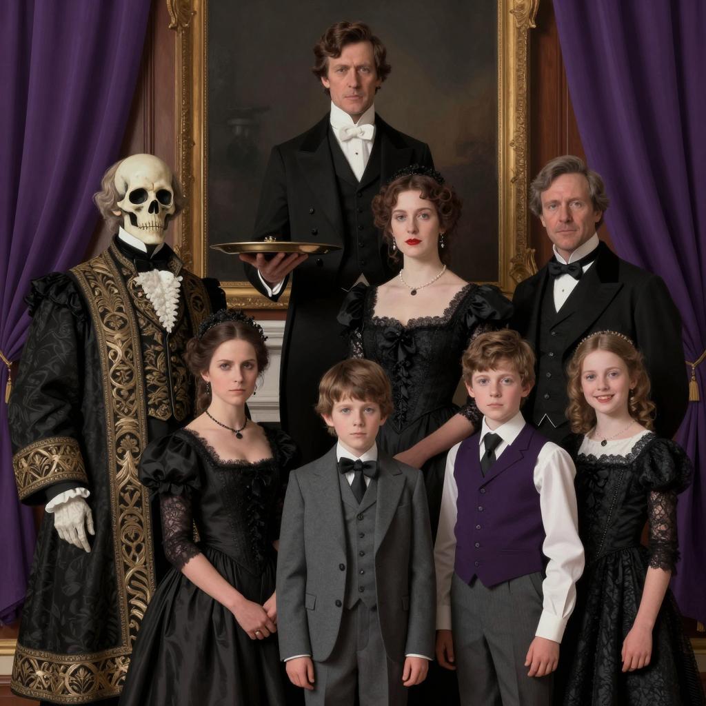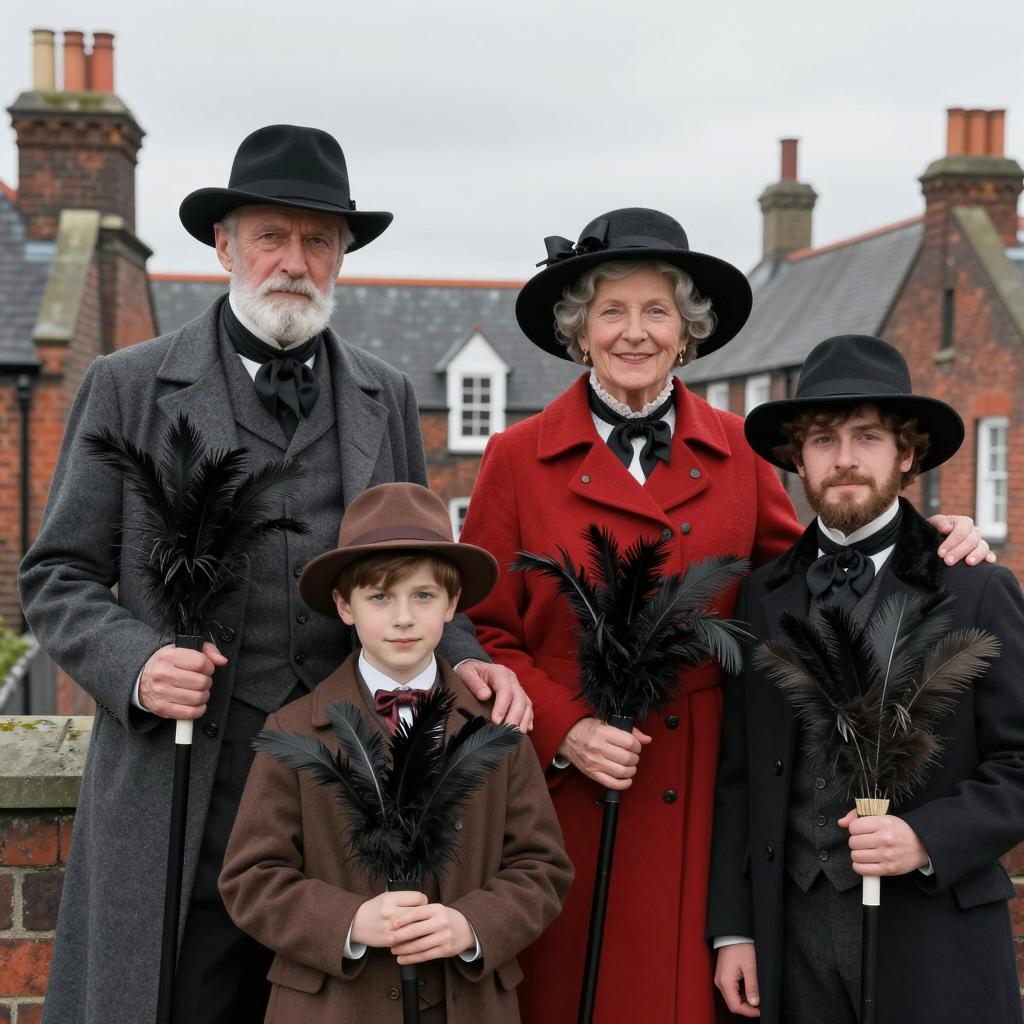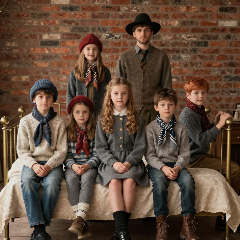 Six people in vintage clothing. Five children sit on a brass bed frame, one girl in a grey dress sits on the bed. Brick wall background. Children wear knitted sweaters, hats, and patterned scarves. One boy holds the bed frame's bars. The girl on the bed has light brown hair, the others have various hair colors. One man in a black hat stands behind the bed. Beige patterned bedspread.