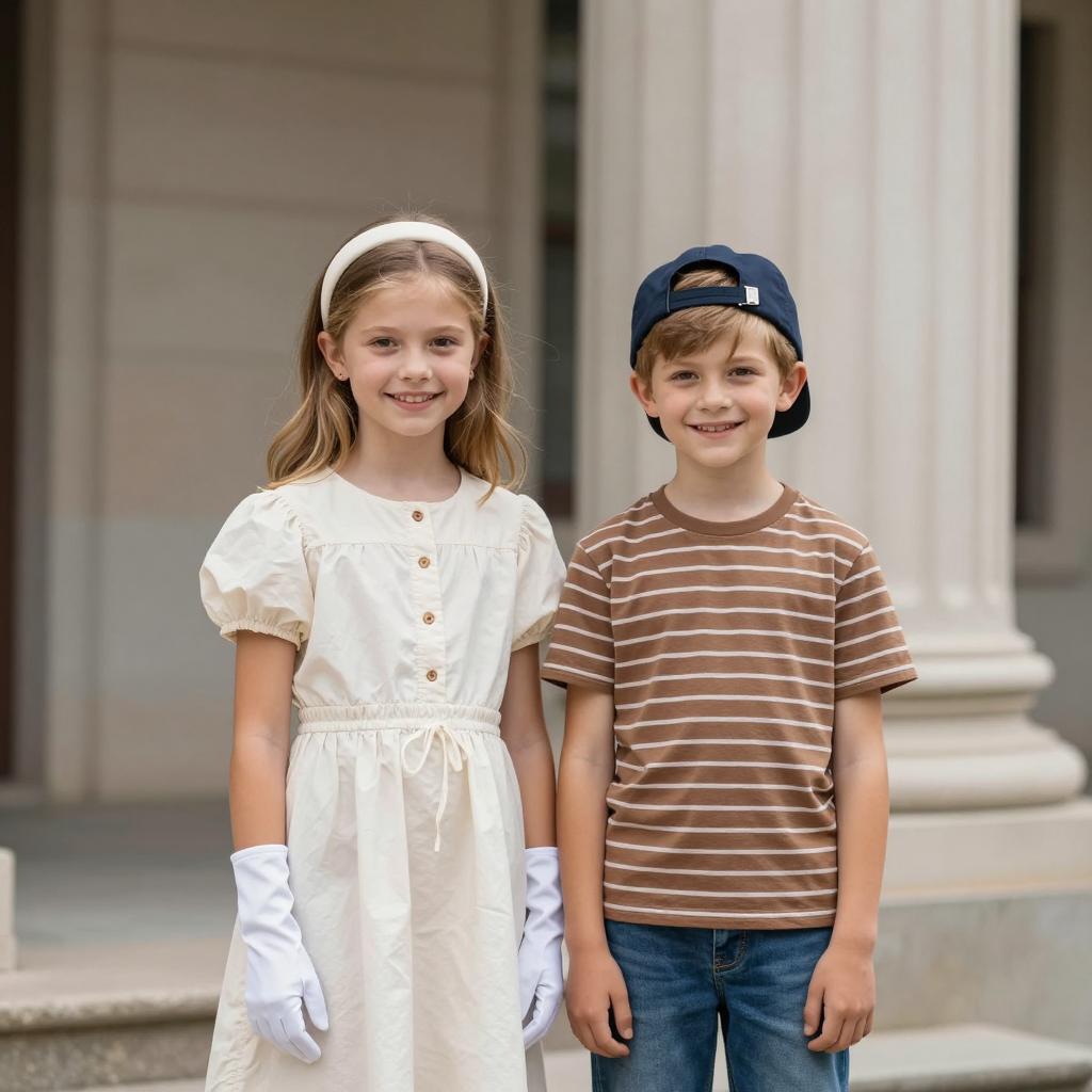 Vintage Children Posing on Brass Bed