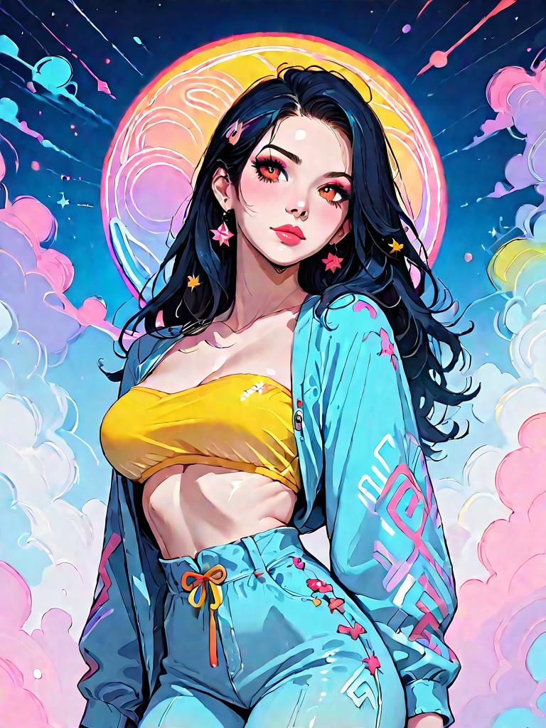 Digital illustration of an anime-style young woman with long black hair wearing a neon blue jacket and matching pants with geometric patterns, paired with a bright yellow bandeau bikini top. She is depicted against a colorful nighttime sky with a large glowing moon and misty clouds, showcasing a trendy and bold fashion style.