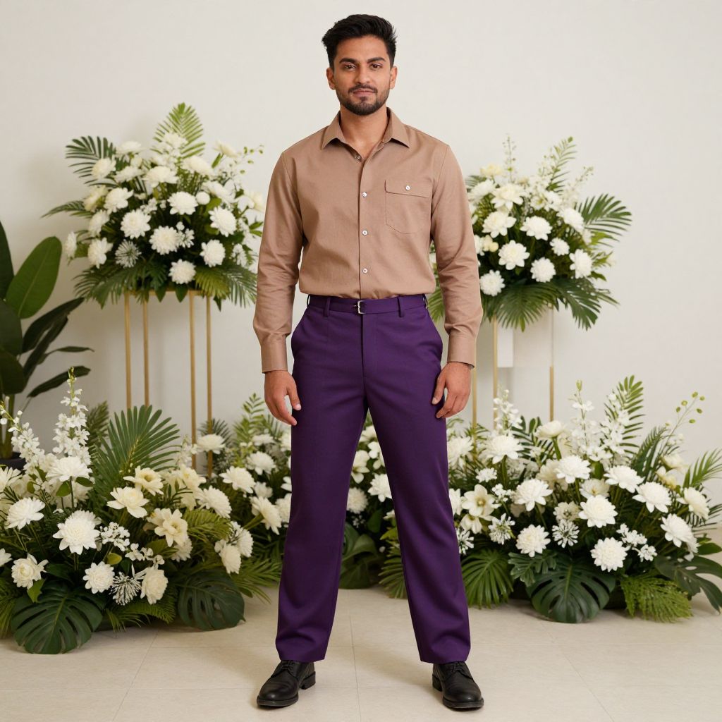 Purple Pants Outfit Costume, man in purple pants and brown shirt standing in front of a floral arrangement